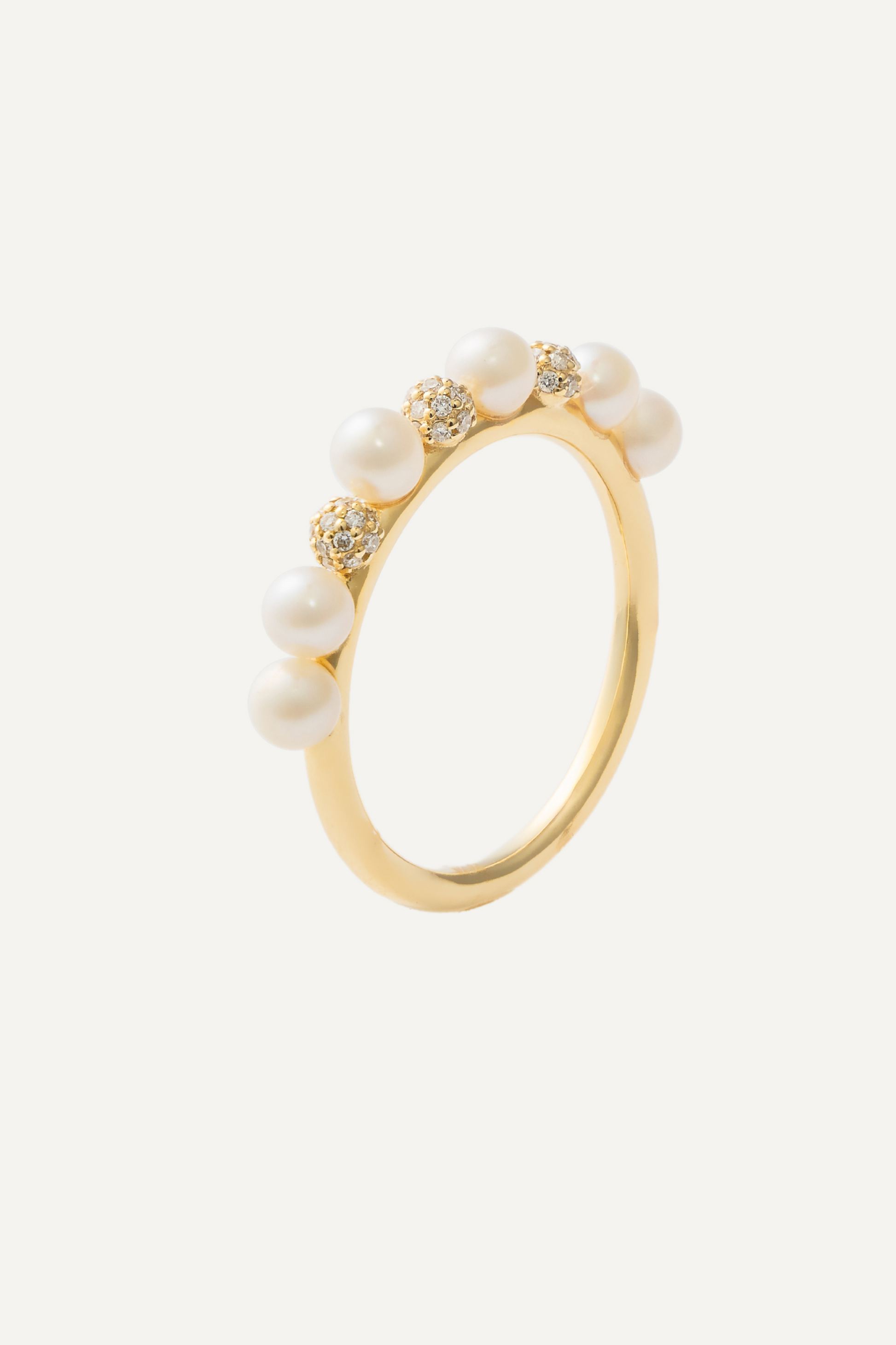 This stunning ring combines the rich allure of gold with the classic beauty of a lustrous pearl and the sparkling brilliance of diamonds.