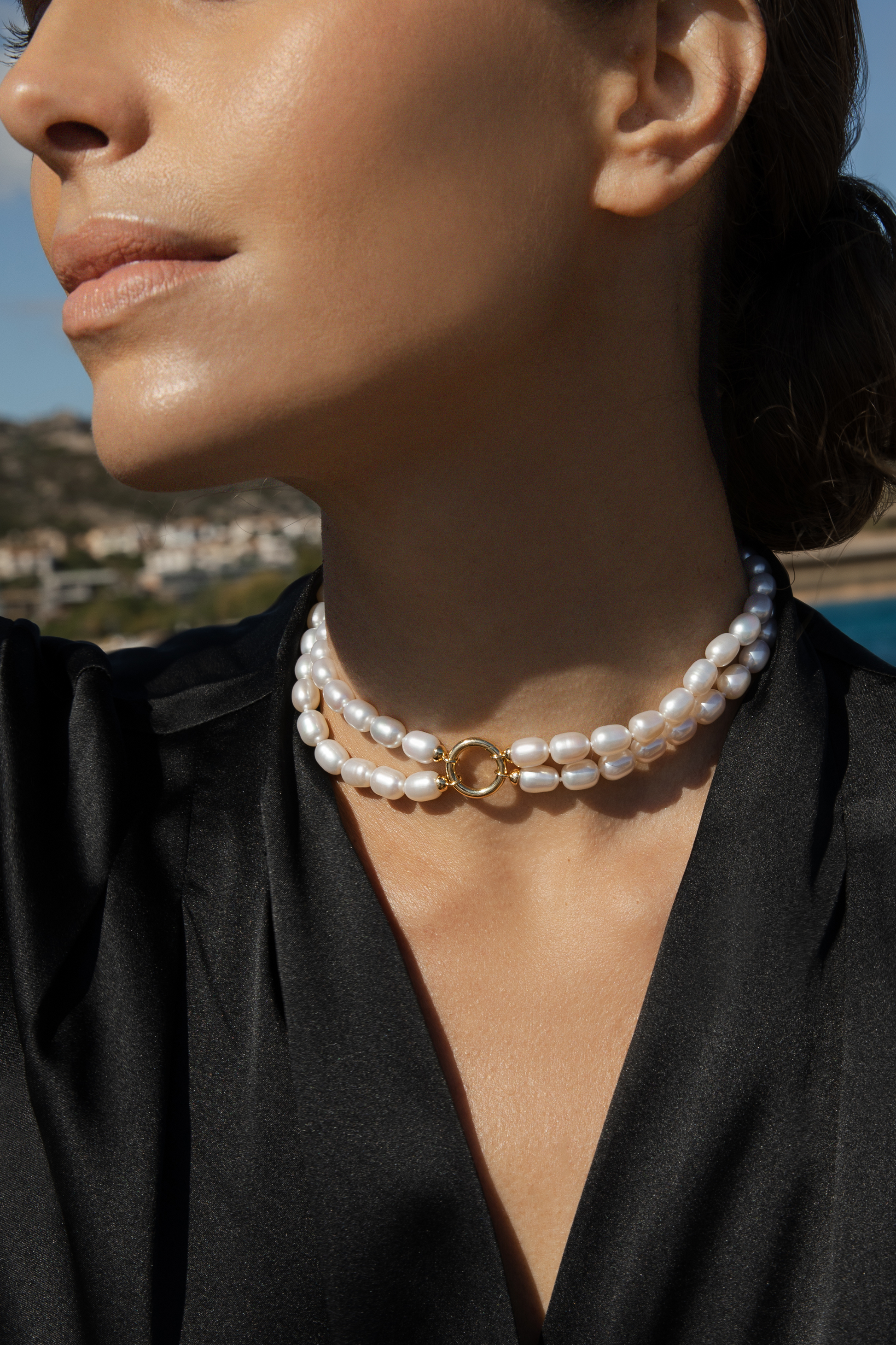Our exquisite double-row pearl necklace is secured with a sleek, round clasp that offers versatile styling.