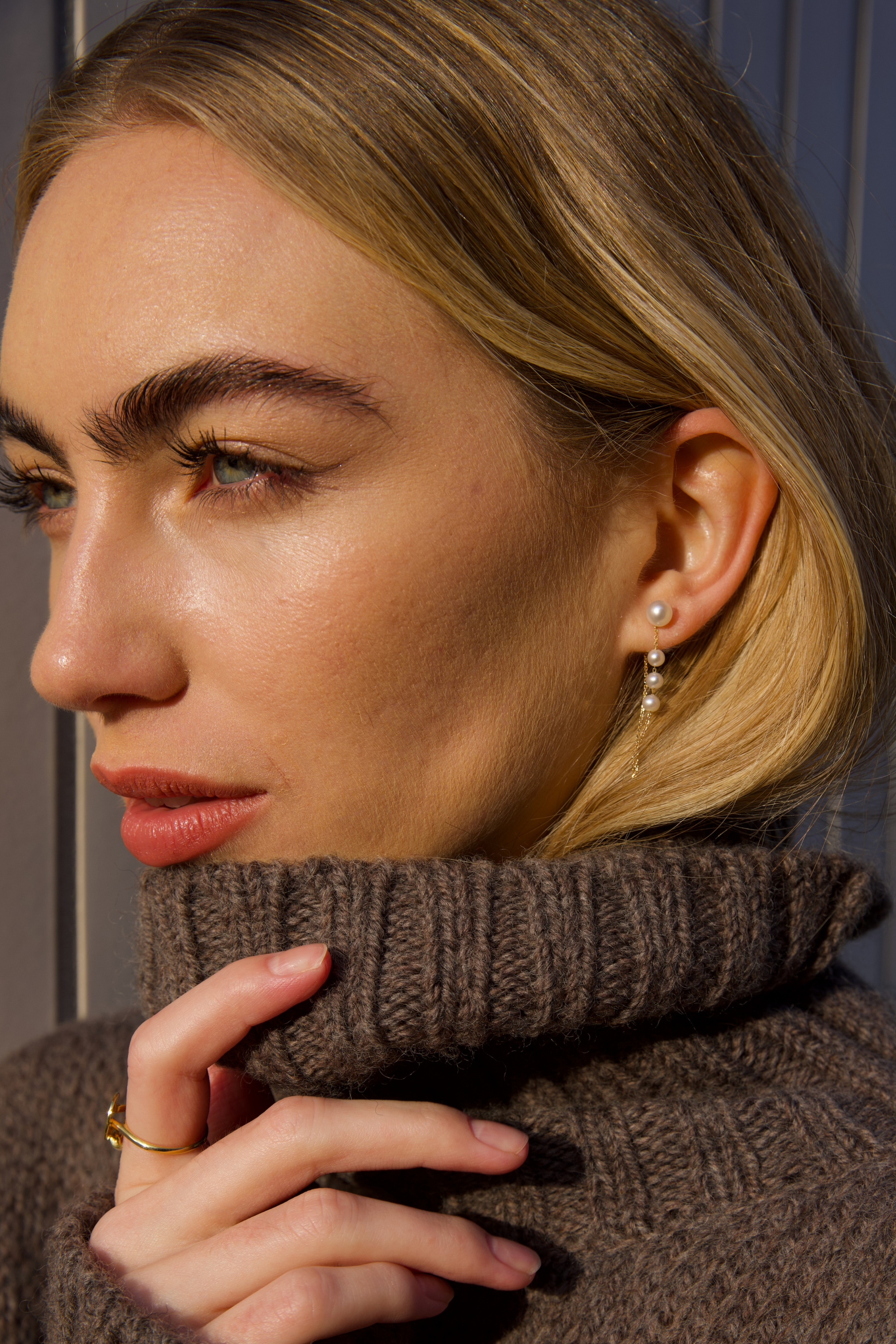 Inspired by the celestial dance, these earrings feature a graceful arrangement of one main Freshwater pearl with three lustrous pearls delicately hanging on 18k Gold chain, creating a cascade of celestial beauty.
