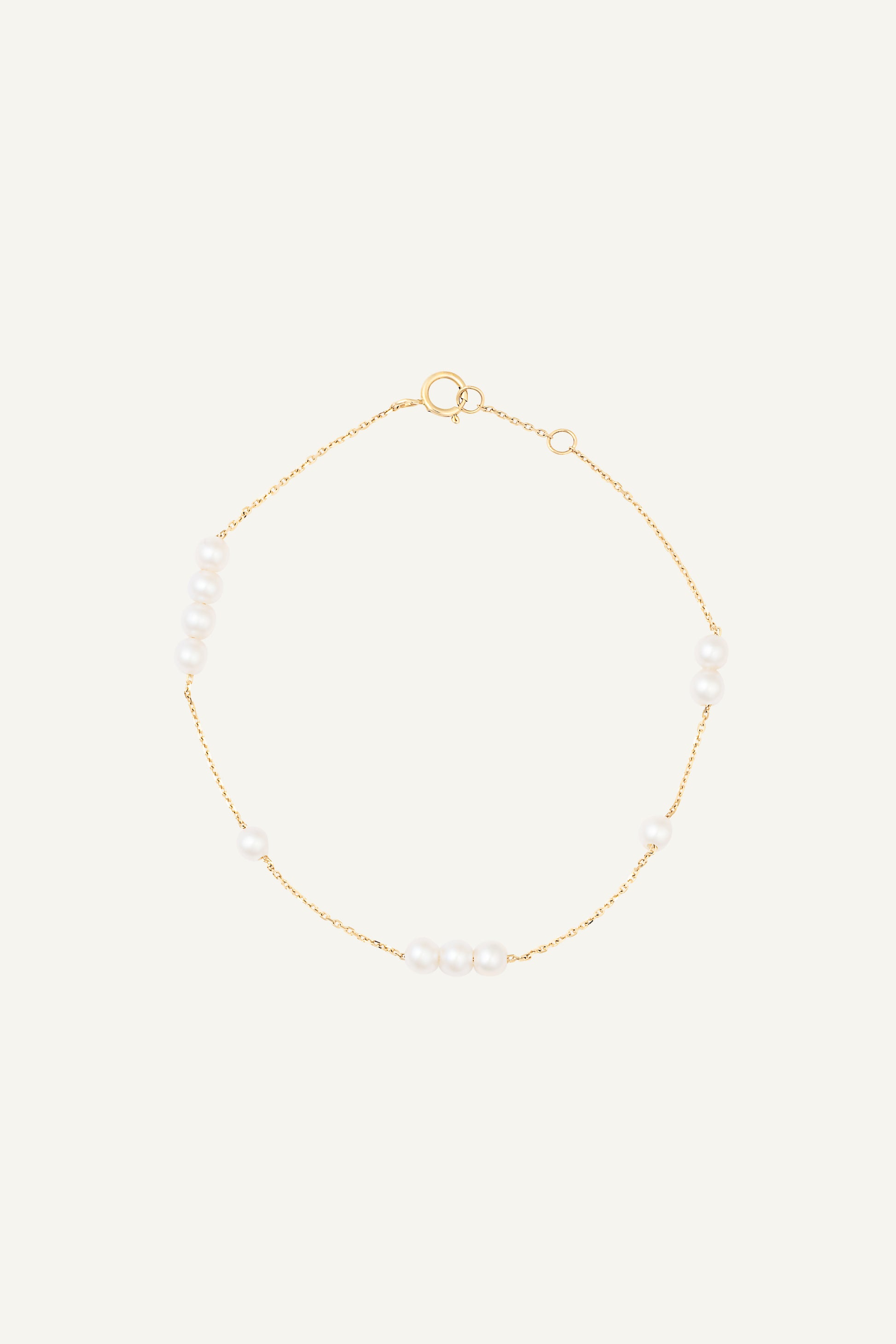 This handmade gold bracelet features 11 shimmering Freshwater pearls delicately sprinkled around the bracelet on an 18k Gold chain.