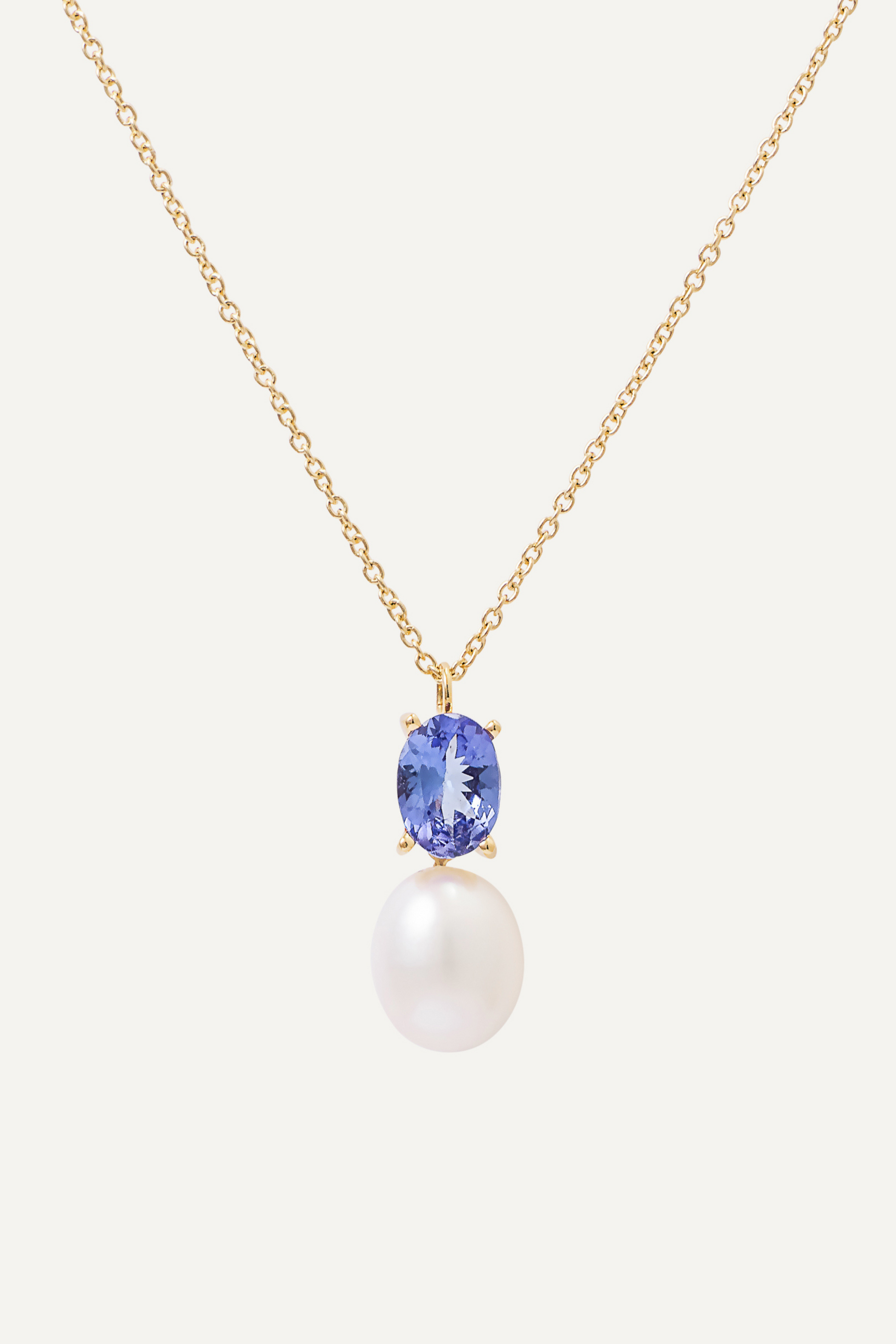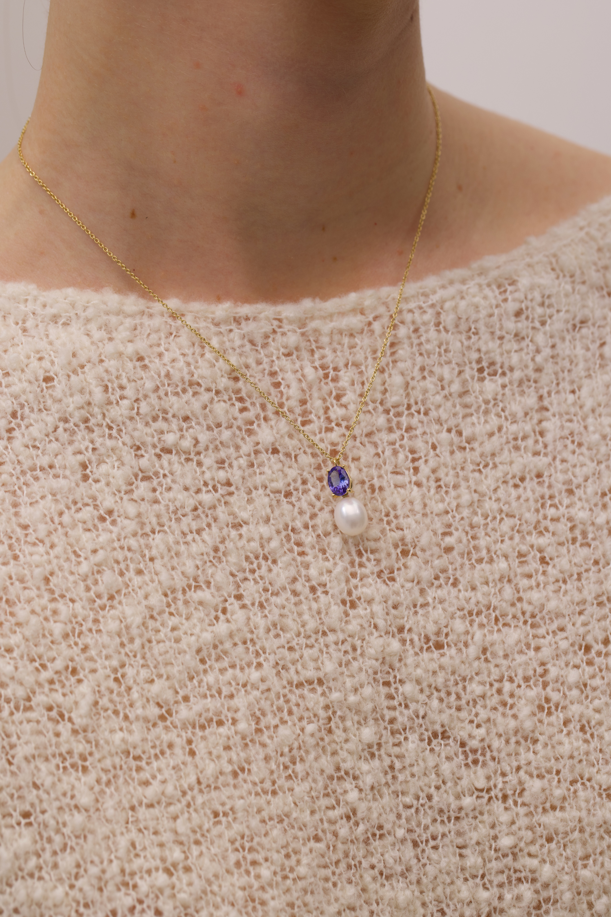 Exquisite Freshwater Drop Pearl on 18k gold necklace adorned with a delicate Blue Tanzanite gem. Blue tanzanite symbolizes strenght, harmony, and great spirit, complementing the timeless elegance of Freshwater Pearls.