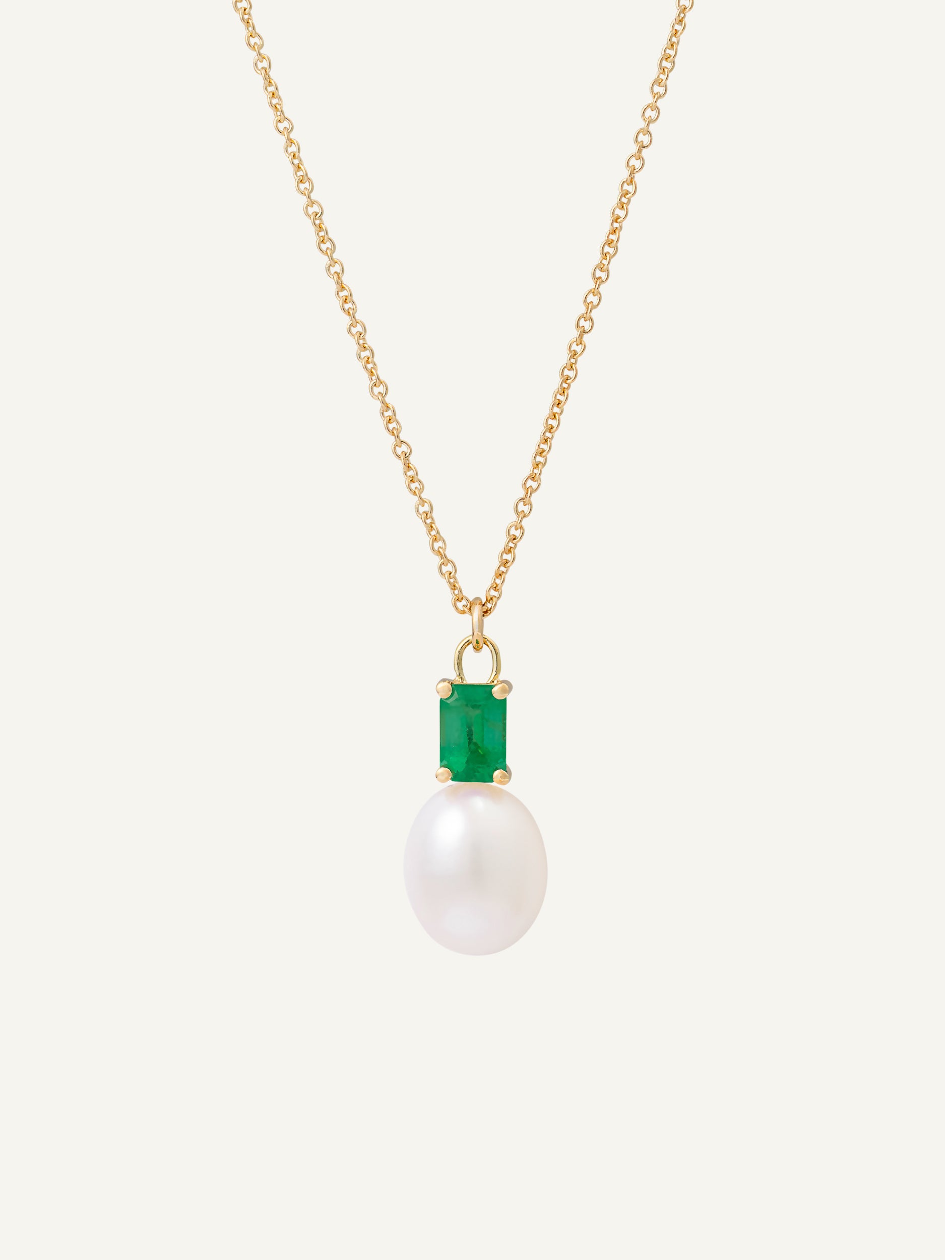 Exquisite Freshwater Drop Pearl on 18k gold necklace adorned with a delicate emerald.