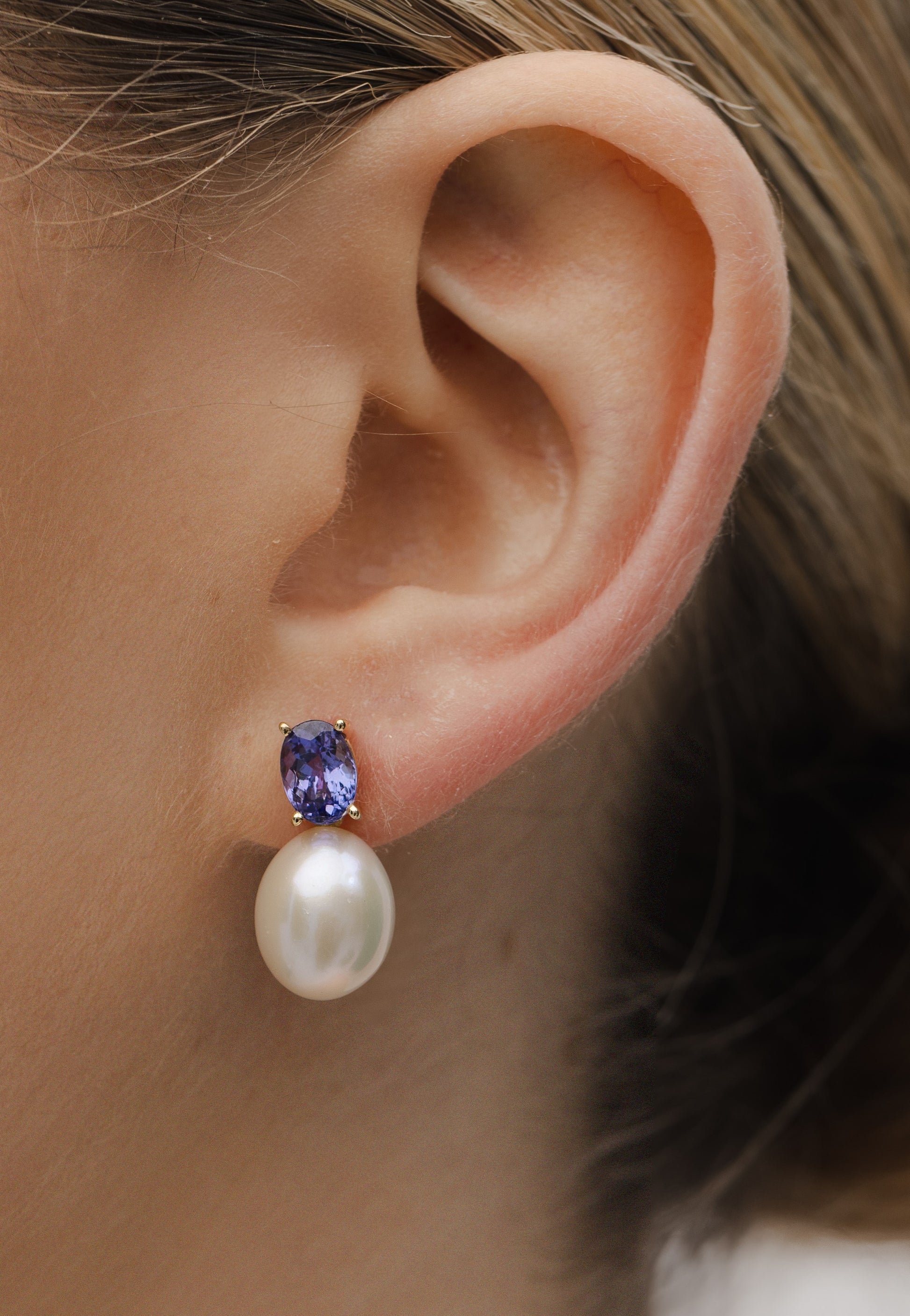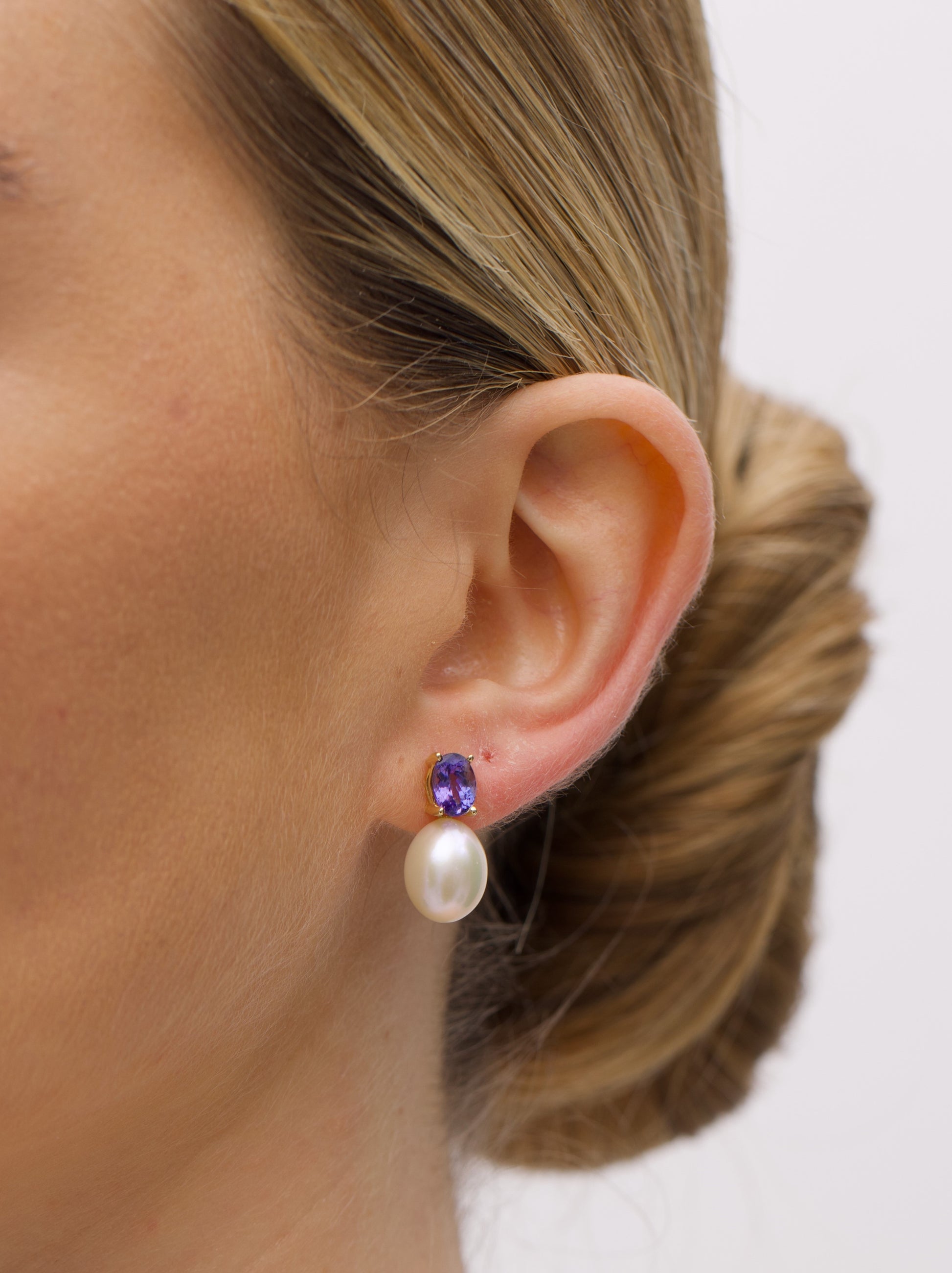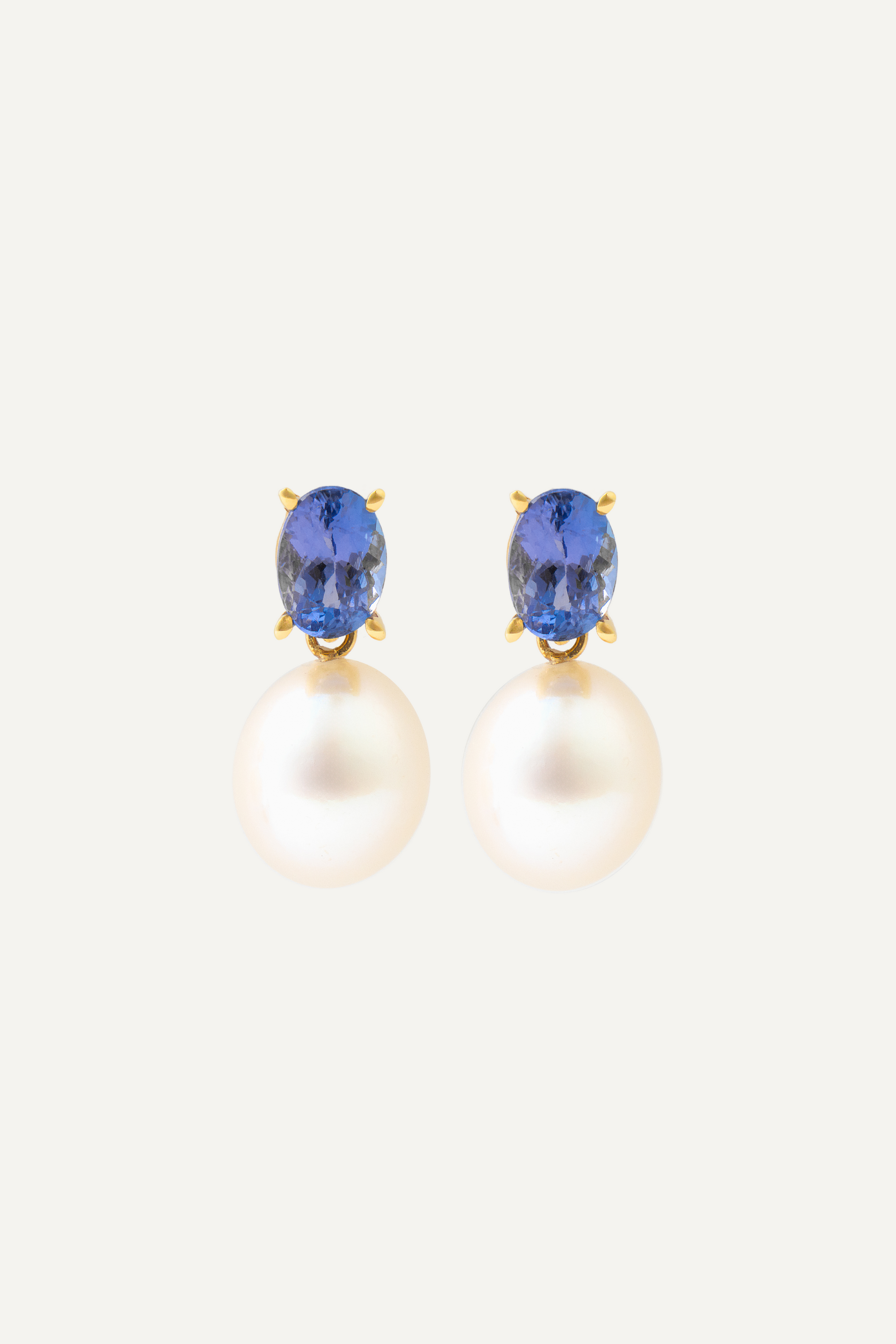 Exquisite Freshwater Pearl on 18k gold studs adorned with delicate Blue Tanzanite gems. Blue Tanzanite symbolizes love, compassion, and emotional healing, complementing the timeless elegance of Freshwater Pearls.