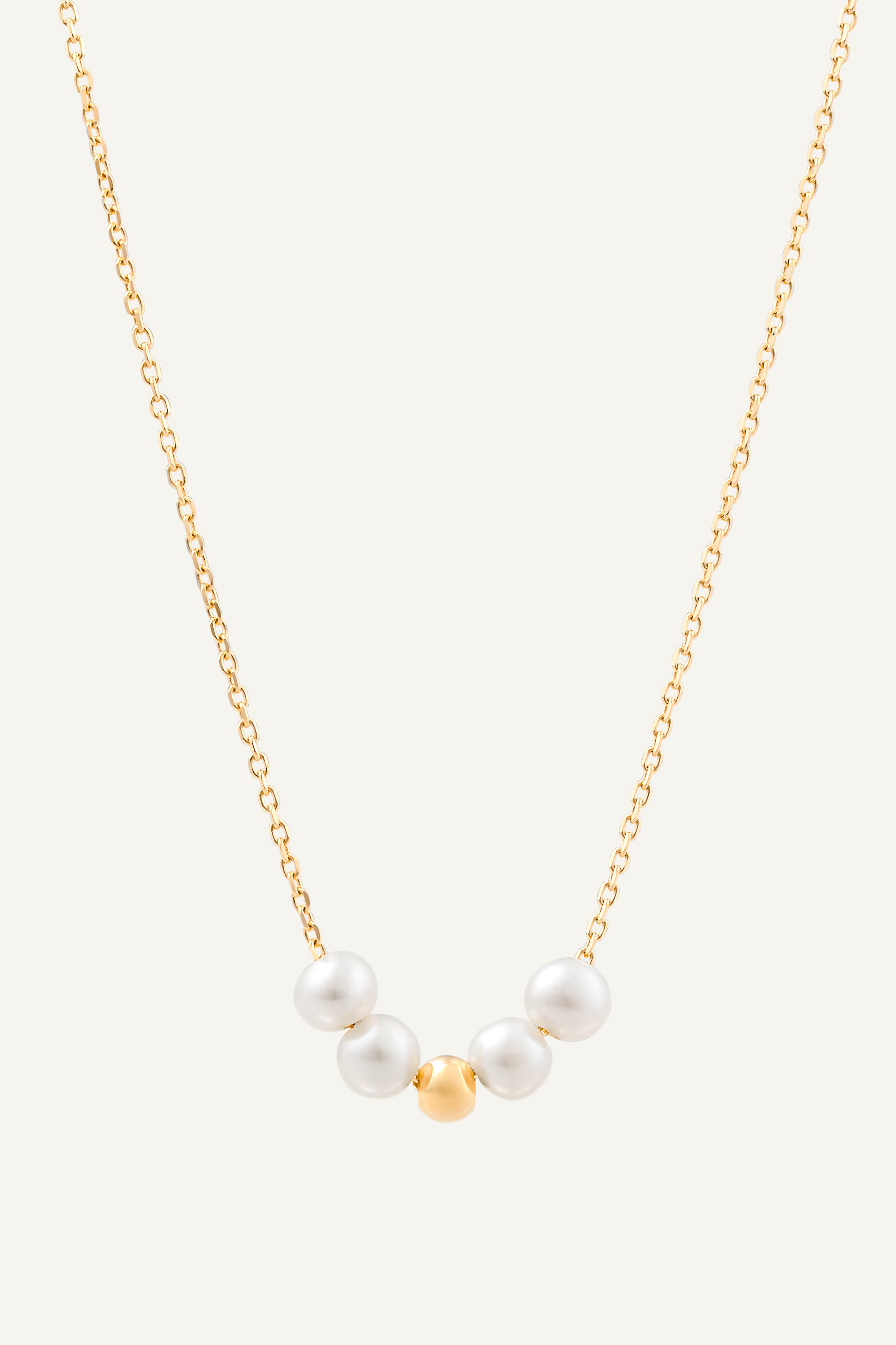 This delicate gold necklace features four luminous freshwater pearls, beautifully balanced around a central gold bead. The minimalist design highlights the timeless elegance of pearls while adding a modern touch with the golden sphere.