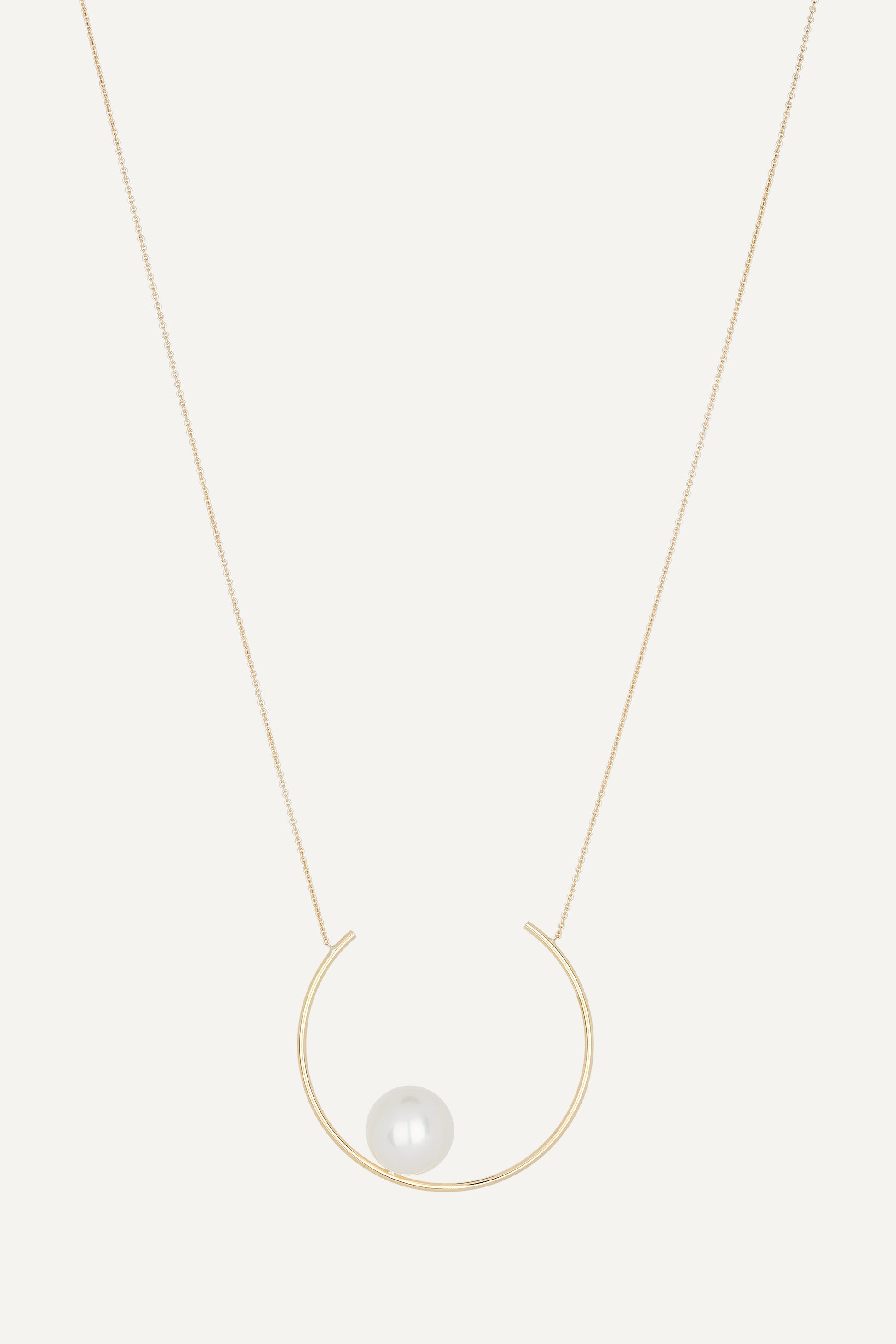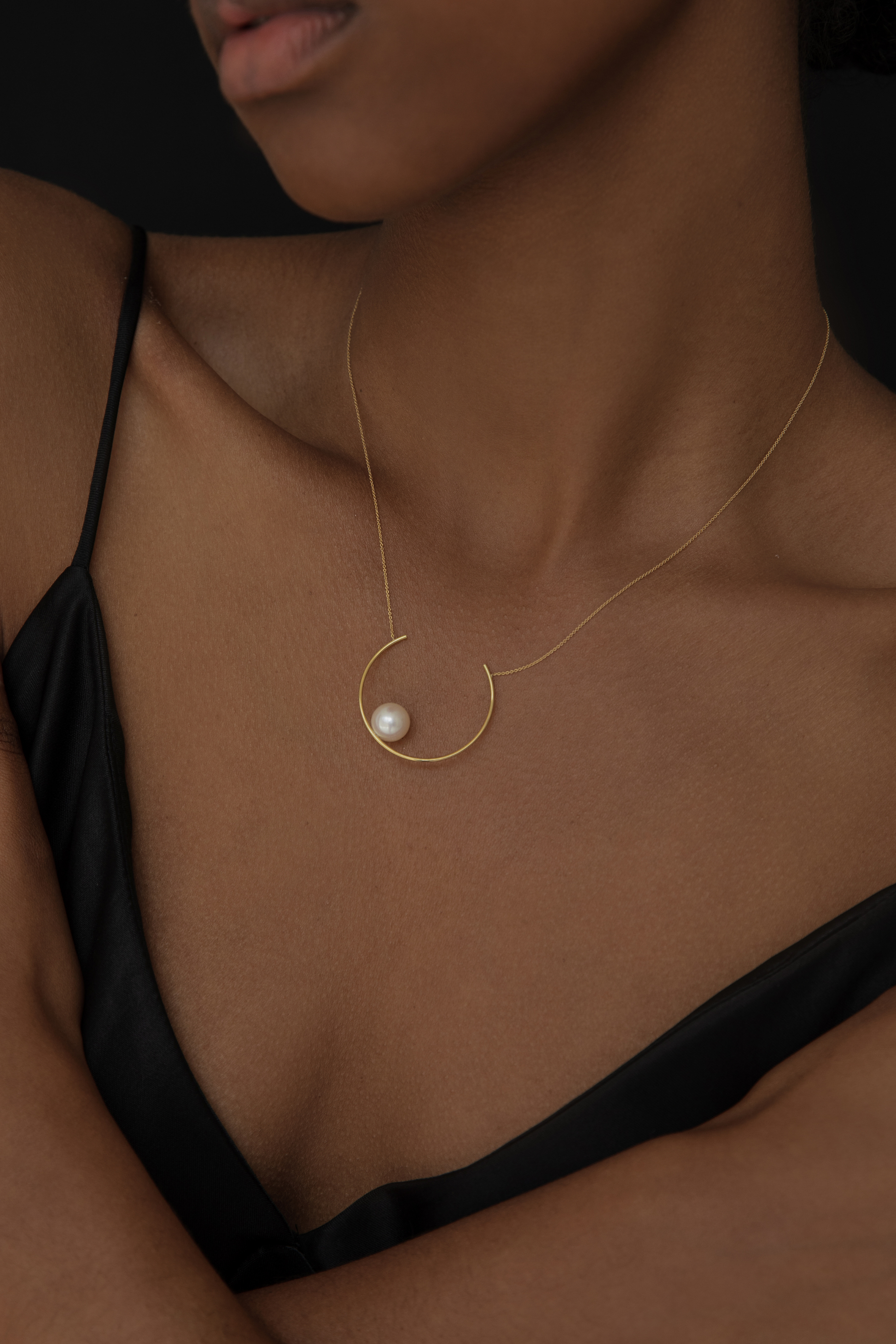 This enchanting necklace features a stunning gold pendant, elegantly shaped like a crescent moon, with a captivating pearl nestled within its embrace.
