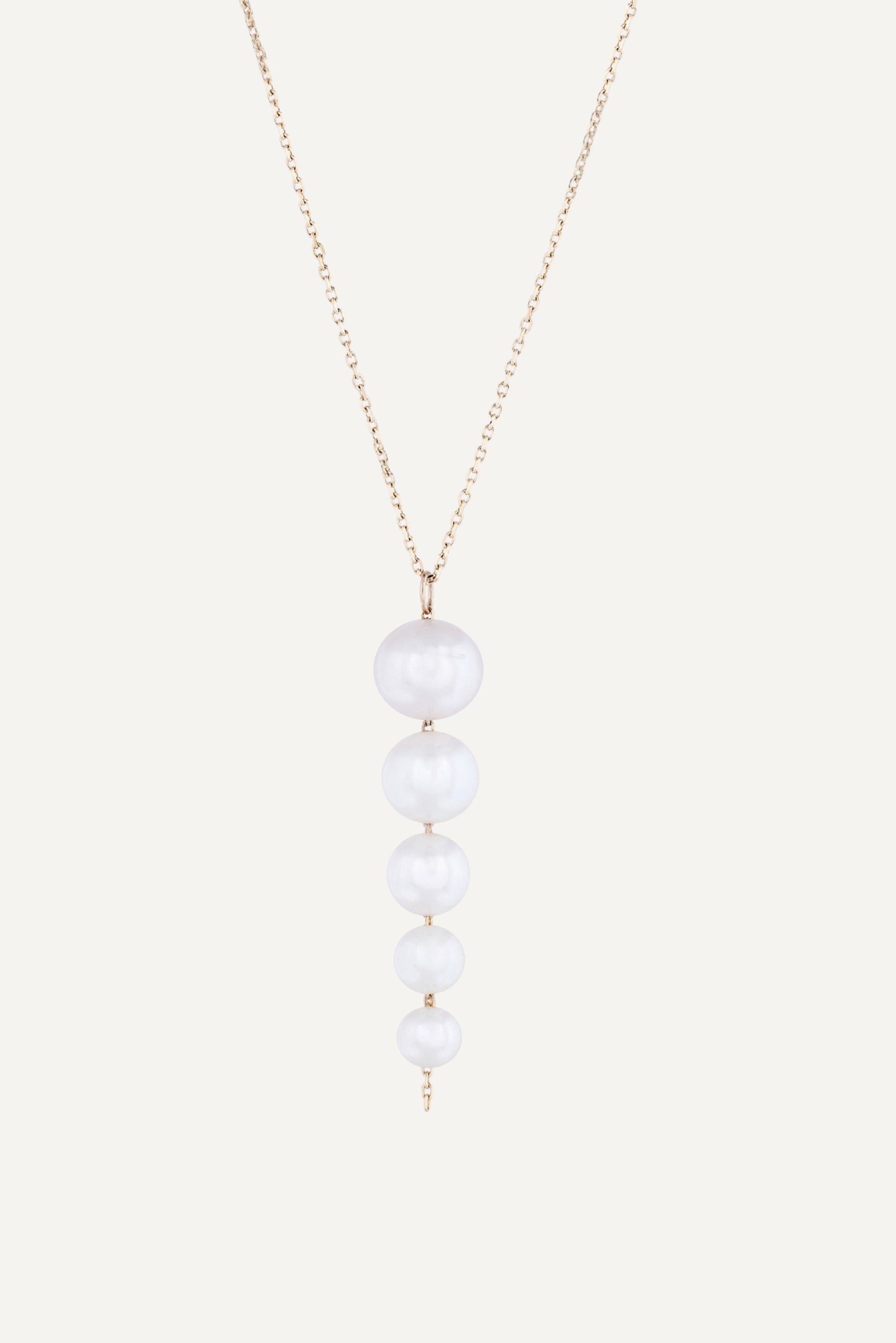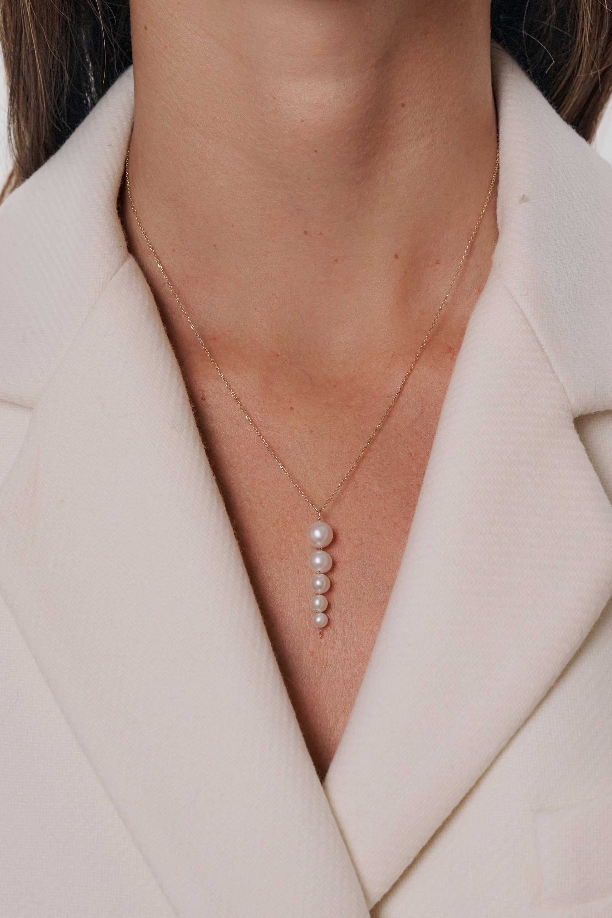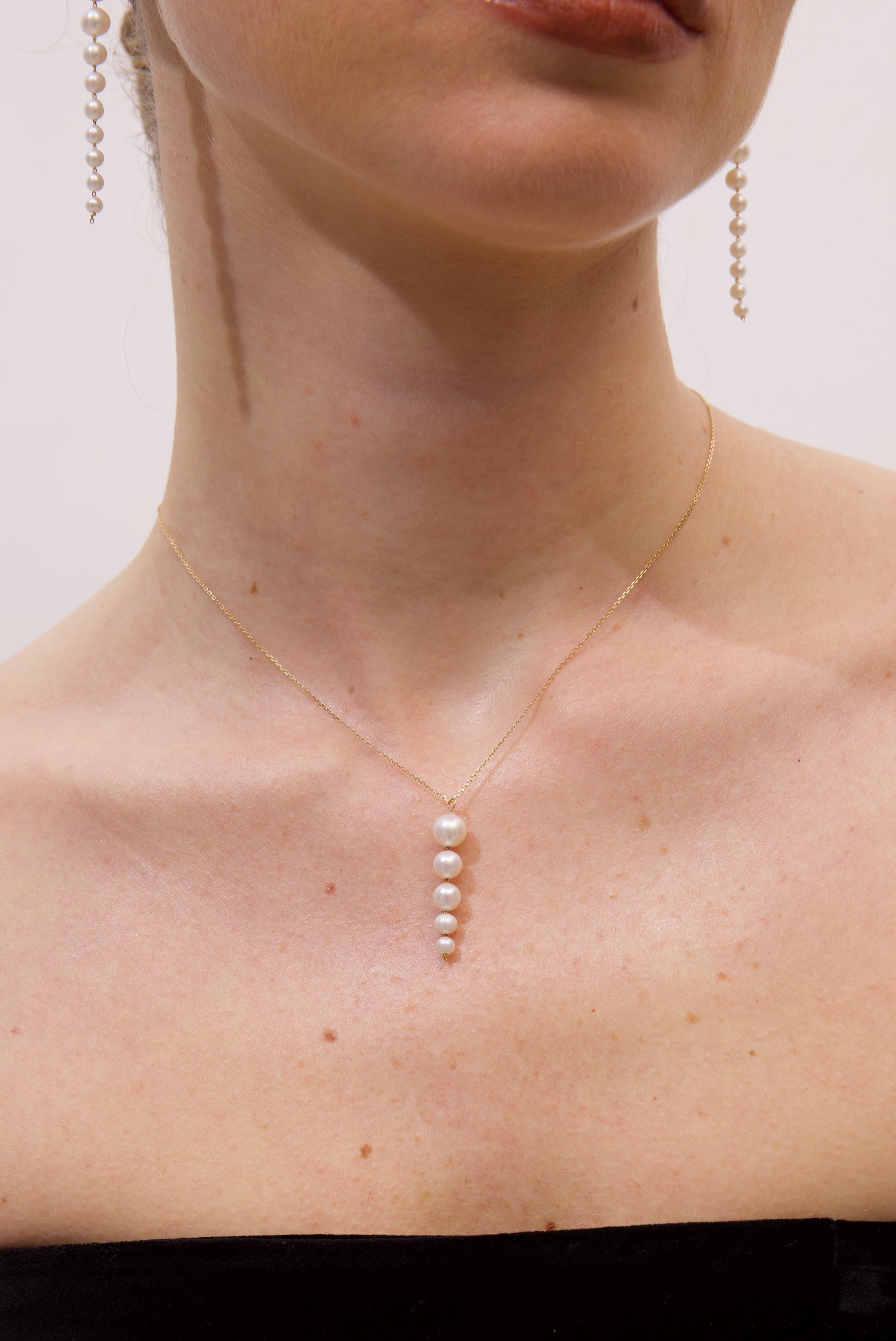 Each pearl, carefully chosen for its luminosity and allure, cascades gracefully from the delicate chain, creating a captivating dance of light and movement. As the pearls sway gently, they emit a soft and enchanting glow, illuminating the neckline.