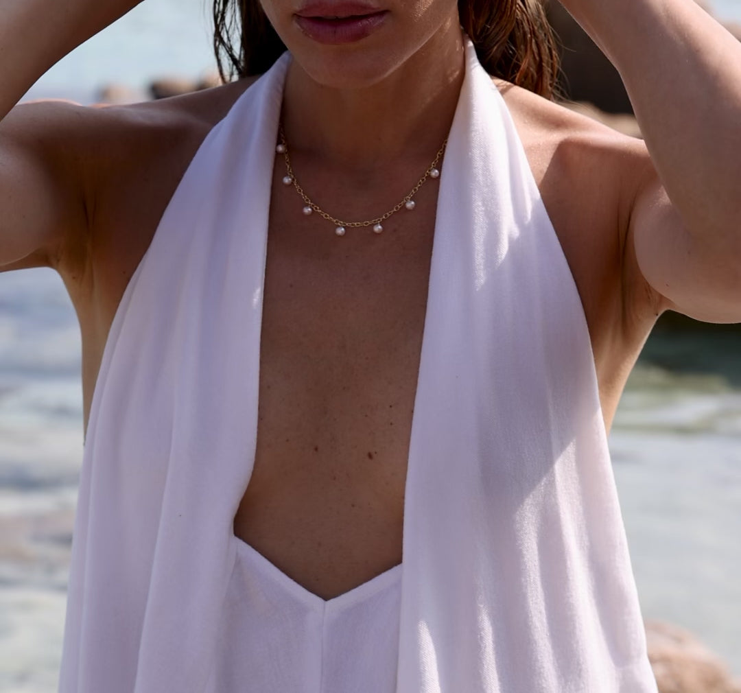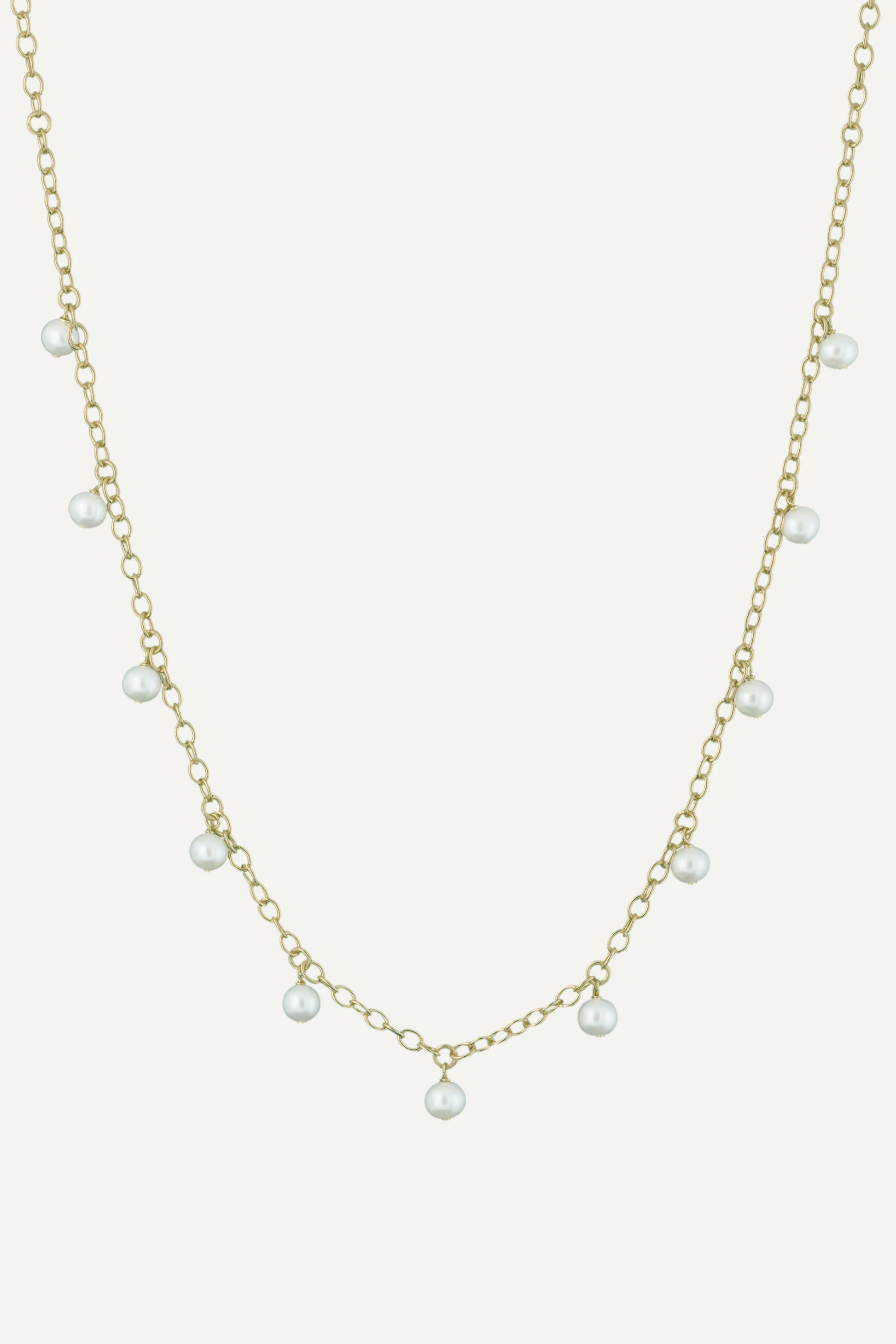 An everyday, classy and elegant necklace with eleven beautiful and shimmering Freshwater pearls. Delicately sprinkled around the necklace on an adjustable 18k Gold Vermeil chain.